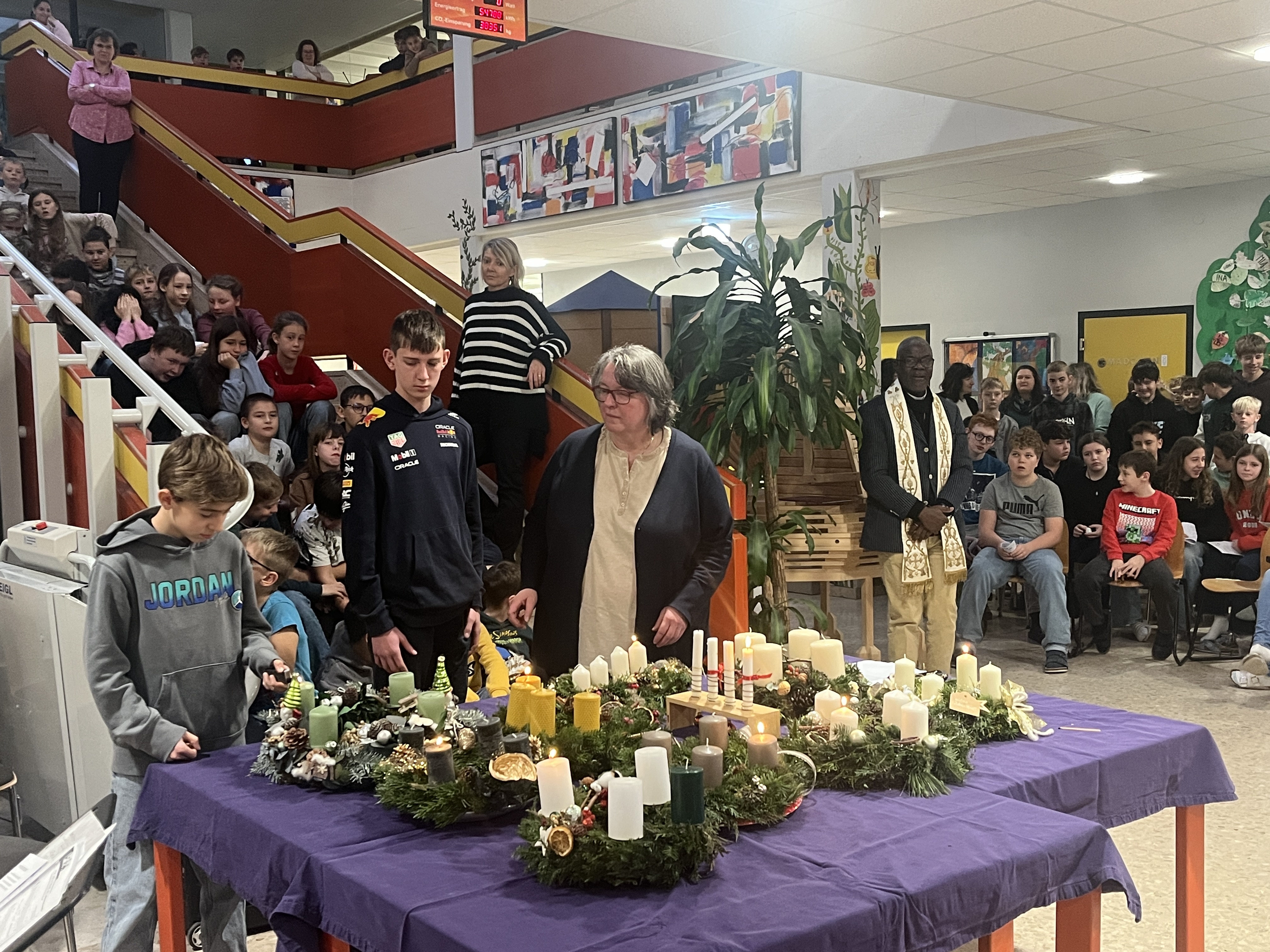 | Wie jedes Jahr starten wir mit einer kleinen Feier in den Advent. Mit Geschichten und Liedern begleitet entzündeten wir die erste Kerze der Adventkränze aus den Klassen. Über den Besuch unseres neuen Pfarrers Innocent zu dieser Feier freuten wir uns alle. | ![]() |